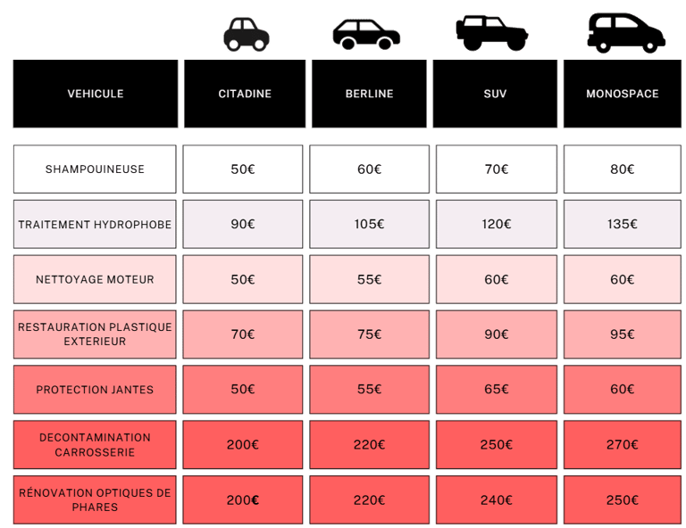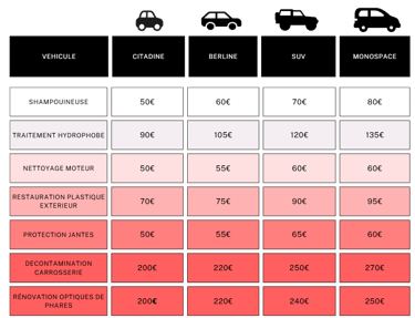 Découvrez nos services de detailing automobile et leurs tarifs compétitifs pour un nettoyage impeccable.